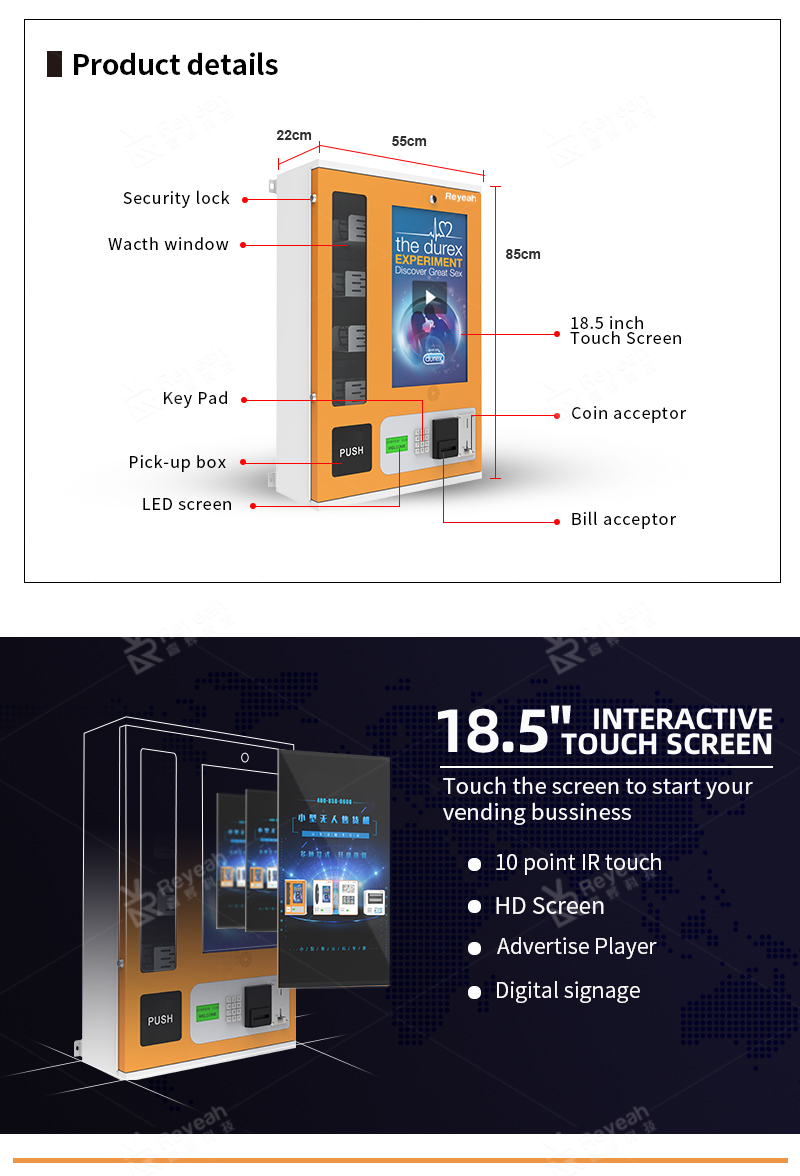 This wall-mounted vending machines can be used to sell snacks, drinks, trading cards, toys, cosmetics, and other small retail products while providing a simple and reliable unattended sales system